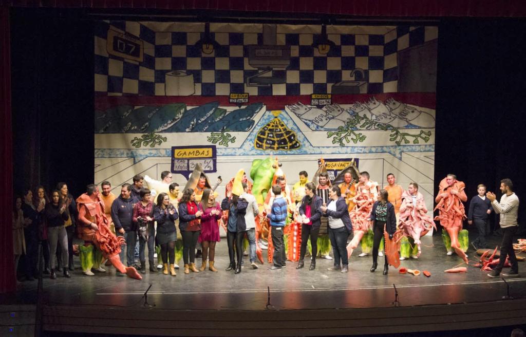 Y para terminar la noche, porque todo termina, aparece la chirigota más esperada por los asistentes. A grito de campeones se abría el telón para la chirigota No me comas la cabeza. Esta agrupación revoluciona al público sin haber hecho, si quiera, el intento de cantar. Sus rimas pegadizas hacen que el patio de butacas cante a la par. Ese es el secreto de su éxito, unas rimas que todos pueden memorizar en poco tiempo y unas letras hechas con mucho cariño y dedicación. La dedicación de su autor Fran Escalante, al que le dedicaron unos minutos para reconocer toda su labor con la entrega de una placa. La noche iba de dedicatorias, como las letras que le dedicaron a la hija de uno de los componentes de la agrupación. Ese pequeño tesoro que esperan a su padre, que cada noche va a ensayar.