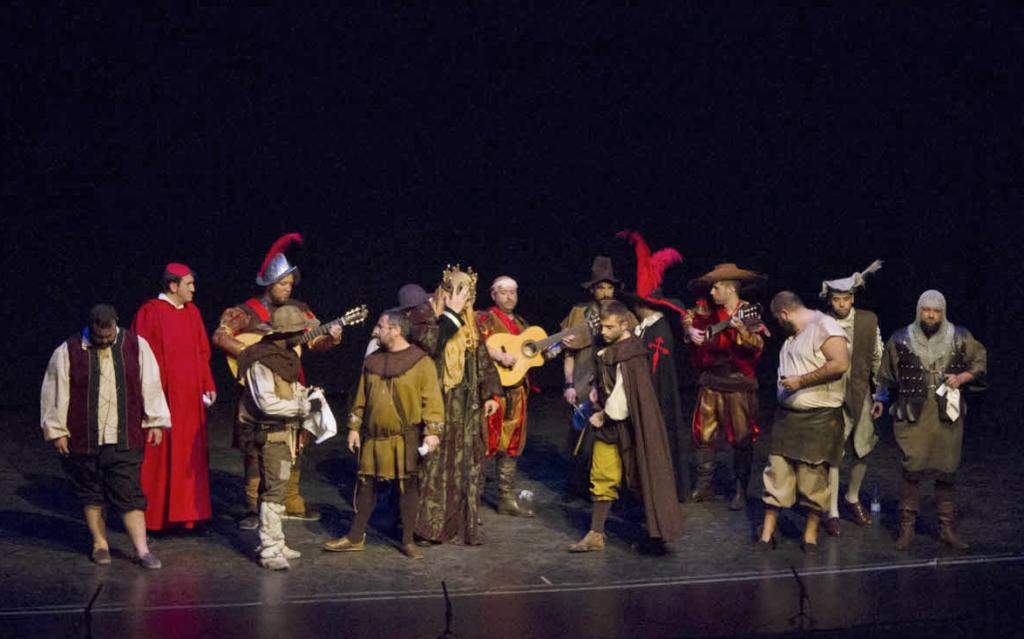 Después de este descanso, recién llegada de participar en el Concurso de Lora del Río, llegaba la comparsa Los de arriba y los de debajo de Alcalá de Guadaíra. Una comparsa con letra de Jesús Gómez y Roberto Leal y bajo la dirección de Antonio Bazalo. Esta agrupación ha participado en 6 finales, consiguiendo el primer premio en Arahal y el segundo en Alcalá. Su tipo de nobles y campesinos hacía un recorrido a lo largo de la historia, representando todas las etapas vividas, desde la edad media hasta la revolución industrial, donde critican las desigualdades socioeconómicas que diferencian a los que están arriba y los que están abajo en la escala social. “Espero que esta historia sirva para acabar con esta historia de los de arriba y los de abajo”. Sus voces, su letra, su tipo, hicieron que el teatro entero se levantara en aplausos.