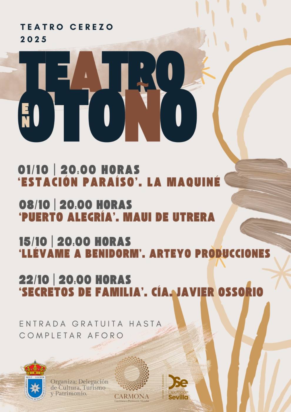 Al margen del legado romano, el octubre carmonense verá ponerse en escena sobre el escenario del Teatro Romanom y con entrada gratuita, varias representaciones de la mano de la Delegación municipal de Cultura, Turismo y Patrimonio del Ayuntamiento. Formando parte del ciclo “Teatro en Otoño” el 1 de octubre la obra” Estación Paraíso” de la compañía La Mauiné, el 8 “Puerto Alegría” de Maui de Utrera y el 15 de octubre “Llévame a Benidorm” de Arteyo Producciones. Cerrando el ciclo el día 22 la obra “Secretos de familia” de la compañía Javier Ossorio.