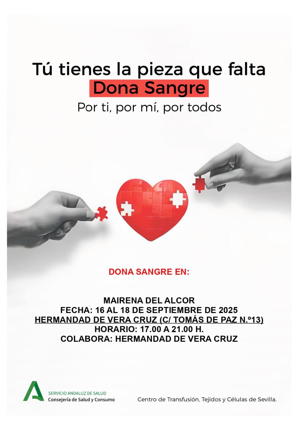 EL MARTES 16, MIÉRCOLES 17 Y JUEVES 18 DE SEPTIEMBRE en la sede de la Hermandad de la Veracruz, sito en calle TOMÁS DE PAZ N.º13, en horario de 17.00 a 21.00 horas. Donde se extraerá sangre de todos los grupos para atender las necesidades actuales del sistema.