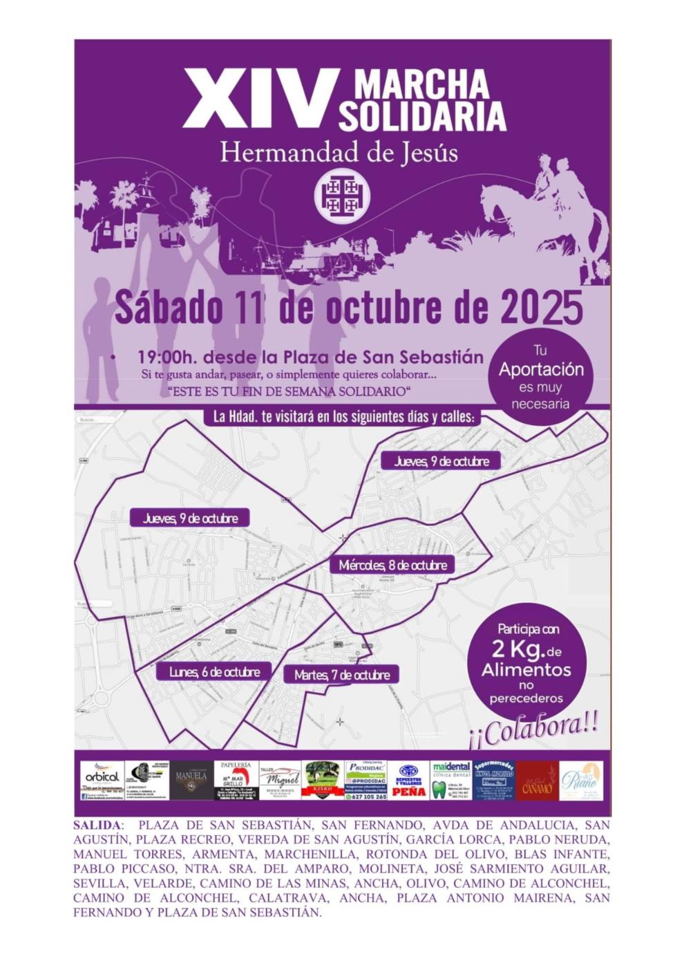 La Hermandad de Nuestro Padre Jesús Nazareno está ultimando los preparativos para su XIV Marcha Solidaria, que tendrá lugar este próximo sábado día 11. Para su inscripción hay que aportar 2 kg de alimentos. Tras su entrega, a cada participante se entregará un dorsal con un número mediante el cual participará en el sorteo de regalos, de los que tras el sorteo se hará entrega a los agraciados al terminar la marcha en la Plaza de San Sebastián.
