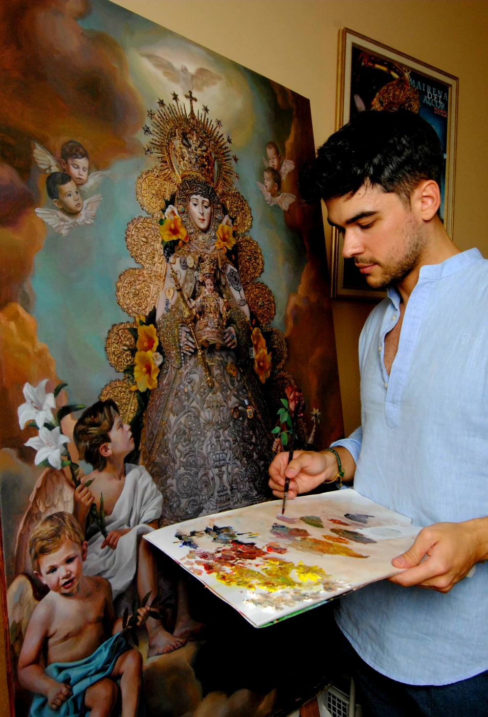 - Hasta ahora el Cartel de la Feria de Mairena del Alcor, en cuya elaboración me hallo involucrado actualmente. Pero nuestro pueblo ha ido en delantera, y así antes hice el de la Patrona Nuestra Señora de los Remedios en el año 2013, el de Semana Santa en 2017, el del Rocío 2022, y ese mismo año también el del Aniversario del patrón San Bartolomé. Luego los encargos empezarían a llegar desde fuera. Así, en 2024 el de Semana Santa de Alicante, y para 2026 tengo entre manos para Gerena el de la Coronación Canónica de La Sangre como último, y desde luego el de Badajoz para la próxima Semana Santa Pacense también.