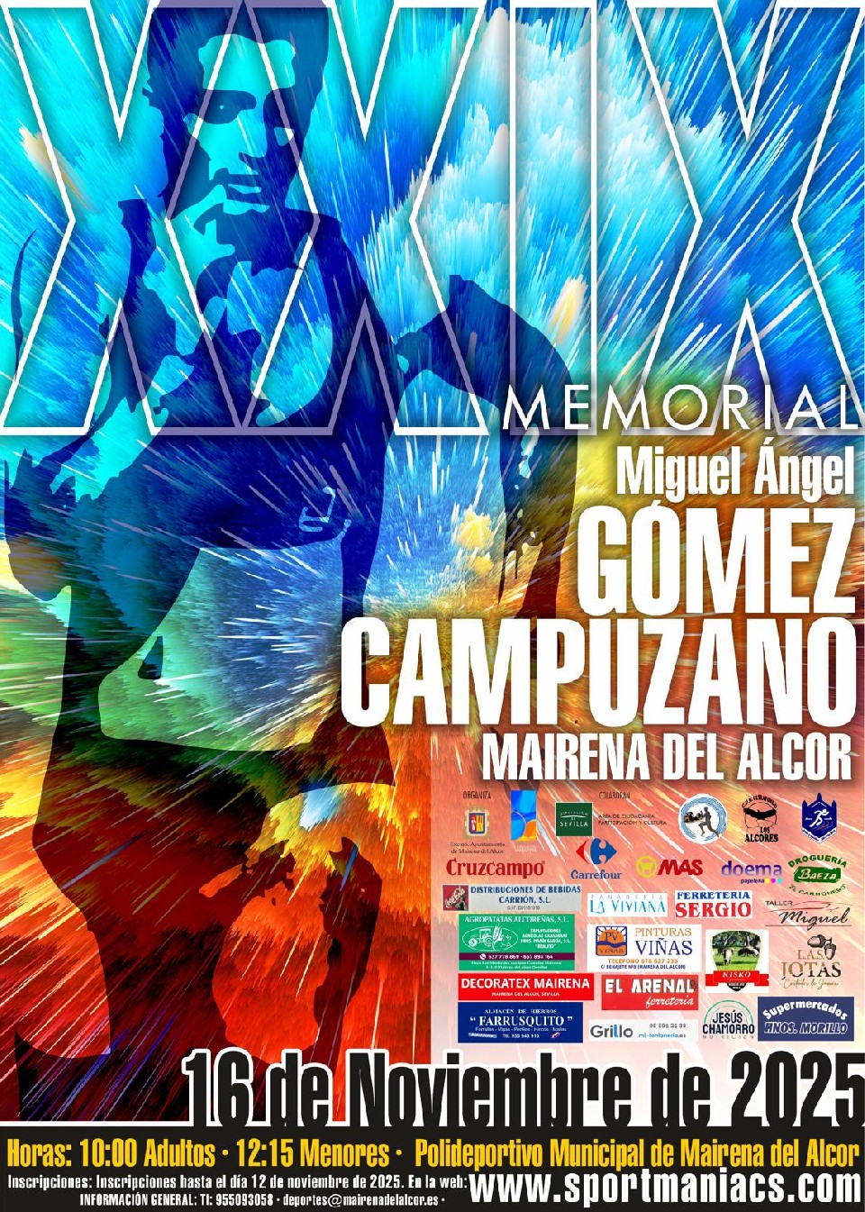 La delegación de Deportes del Ayuntamiento de Mairena del Alcor tiene plazo abierto para la nueva edición del Memorial Miguel Ángel Gómez Campuzano de atletismo en este año 2025, cuando cumple su XXIX edición. La fecha de celebración será el 16 de noviembre a partir de las 10 horas, y para ello está abierto el plazo de inscripción hasta el 12 de noviembre a las 23:59 horas a través de la web sportmaniacs, cuyo enlace compartimos a continuación.