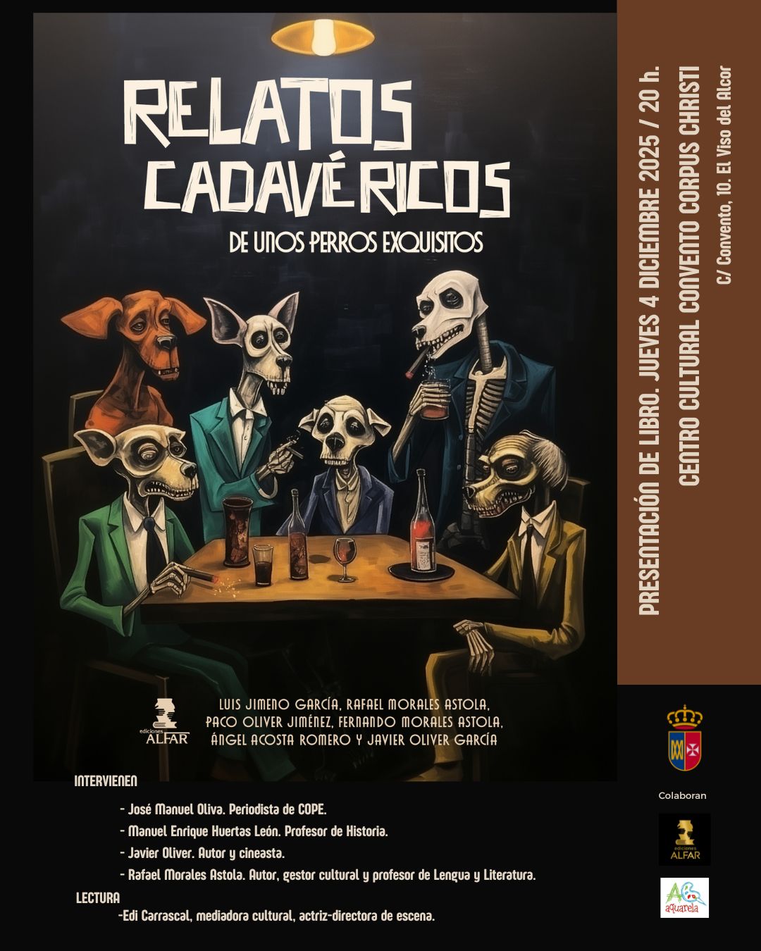El Centro Cultural Convento del Corpus Christi de El Viso del Alcor (C/ Convento, 10) acogerá este jueves día 4 de diciembre a partir de las 8 de la tarde la presentación de la obra ‘Relatos cadavéricos de unos perros exquisitos’ (Editorial Alfar), un volumen de relatos que firman colectivamente Luis Jimeno García, Rafael Morales Astola, Paco Oliver Jiménez, Fernando Morales Astola, Ángel Acosta Romero y Javier Oliver García.