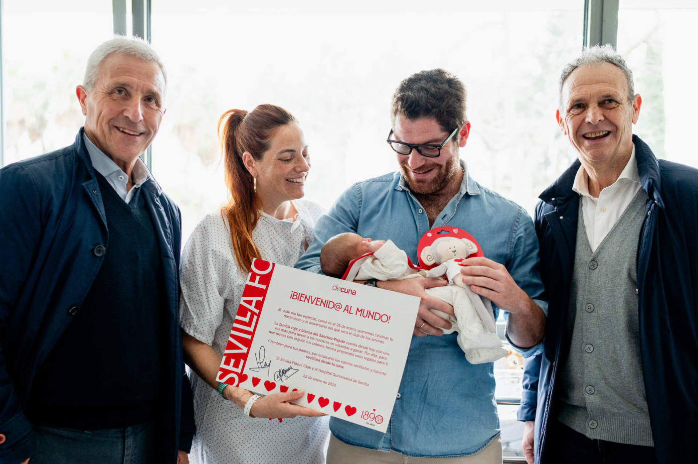 El Hospital Materno-Infantil Quirónsalud Sevilla ha participado, por segundo año consecutivo, en la iniciativa ‘Sevillistas de cuna’ impulsada por el Sevilla FC, una campaña cuyo propósito es dar la bienvenida a los recién nacidos sevillistas desde sus primeros días de vida. Con motivo del 136 aniversario del Sevilla FC, el centro ha colaborado en la entrega de un kit de bienvenida a siete recién nacidos cuyas fechas de nacimiento coincidieron con esta efeméride. En esta ocasión, la acción ha contado con la participación de Joaquín Caparrós, presidente de Honor del Sevilla FC, y Pablo Blanco, embajador del club y Dorsal de Leyenda, quienes acompañaron a las familias en este gesto simbólico.