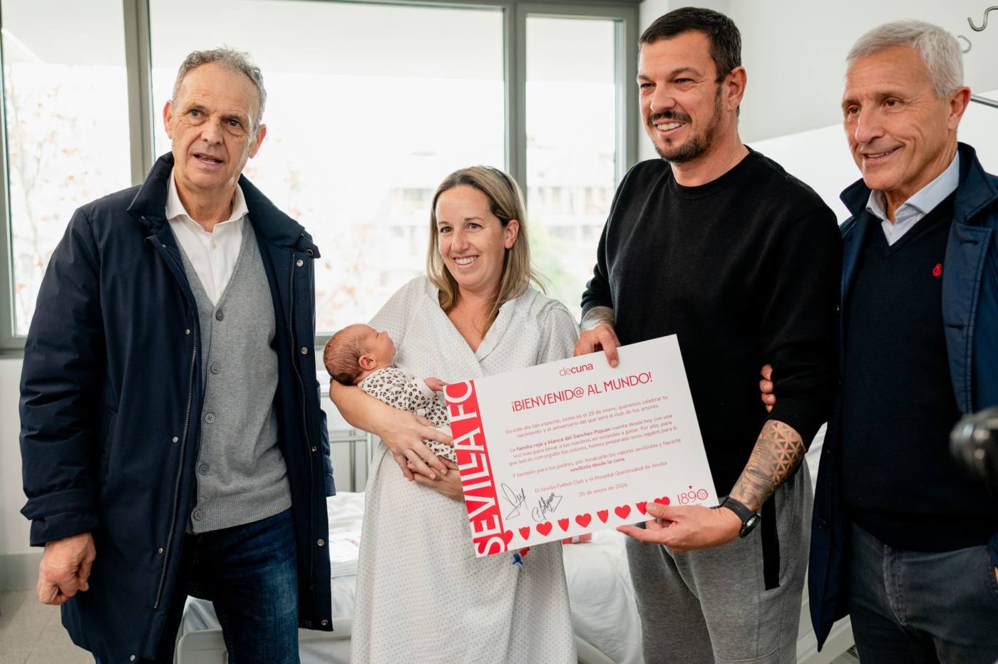 El centro participa por segundo año consecutivo en esta iniciativa del Sevilla FC y entrega un kit de bienvenida a siete recién nacidos en presencia de Joaquín Caparrós y Pablo Blanco