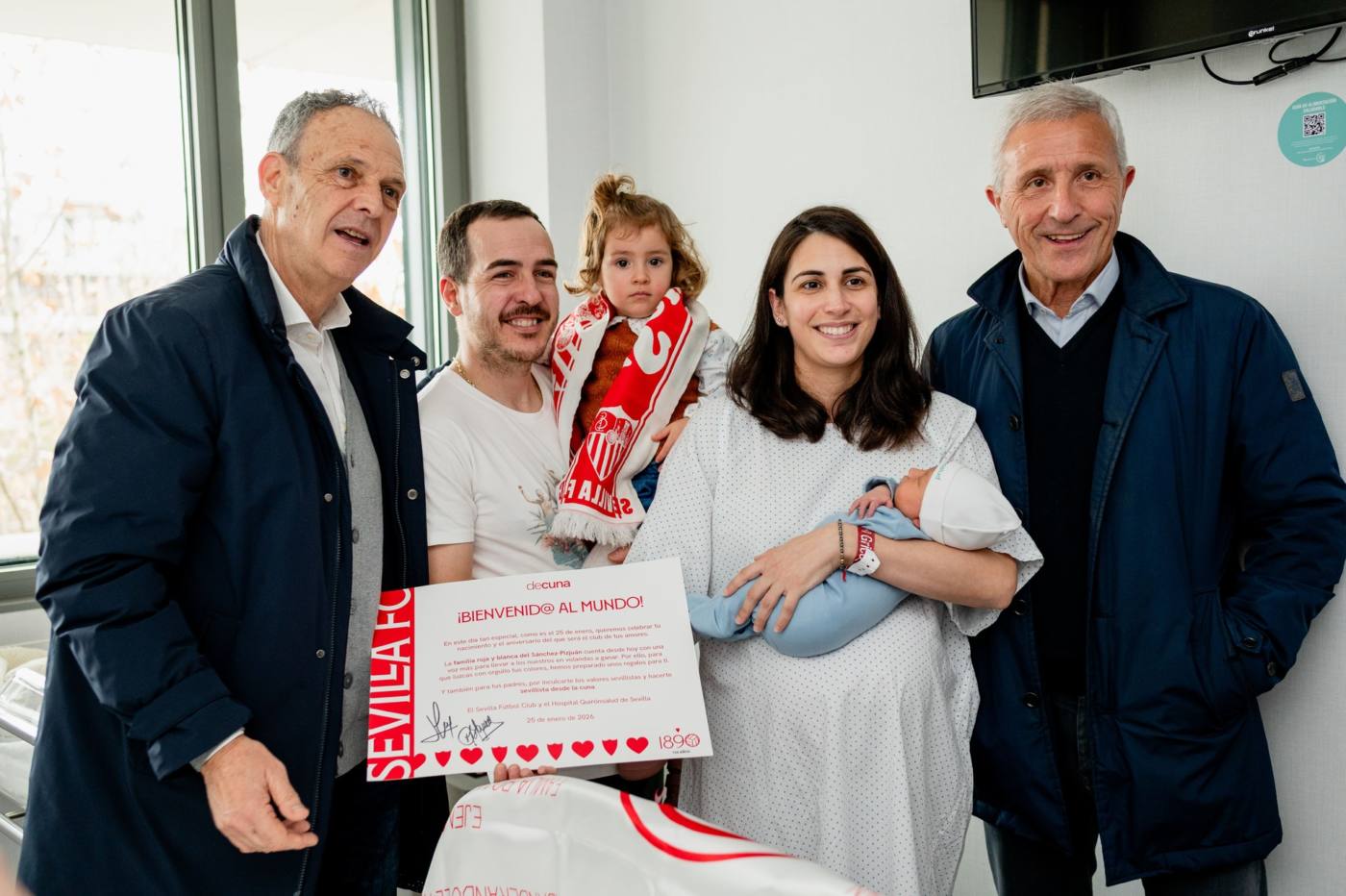 El centro participa por segundo año consecutivo en esta iniciativa del Sevilla FC y entrega un kit de bienvenida a siete recién nacidos en presencia de Joaquín Caparrós y Pablo Blanco