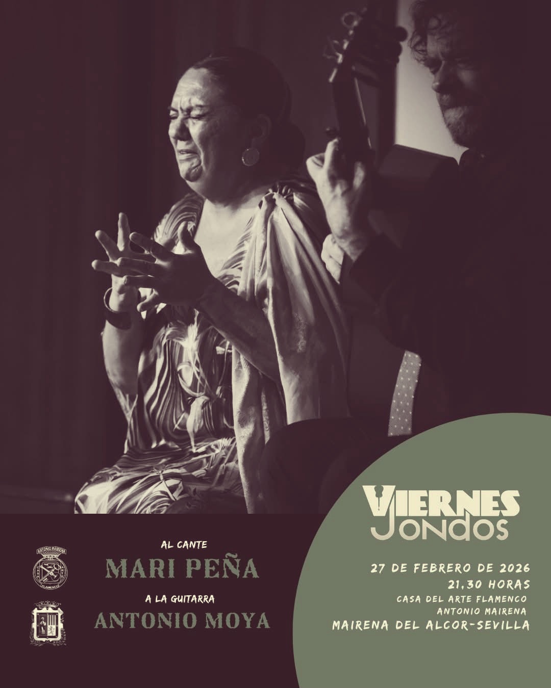 Este fin de semana regresan los Viernes Jondos de la Casa del Arte Flamenco Antonio Mairena, con la colaboración del Ayuntamiento de Mairena del Alcor, desde las 21:30 horas en la sede de la peña. Como es habitual, con entrada libre hasta completar el aforo. La cita es con el cante de la utrerana Mari Peña y el toque del guitarrista Antonio Moya, nacido en Nimes (Francia), y marido de la cantaora.