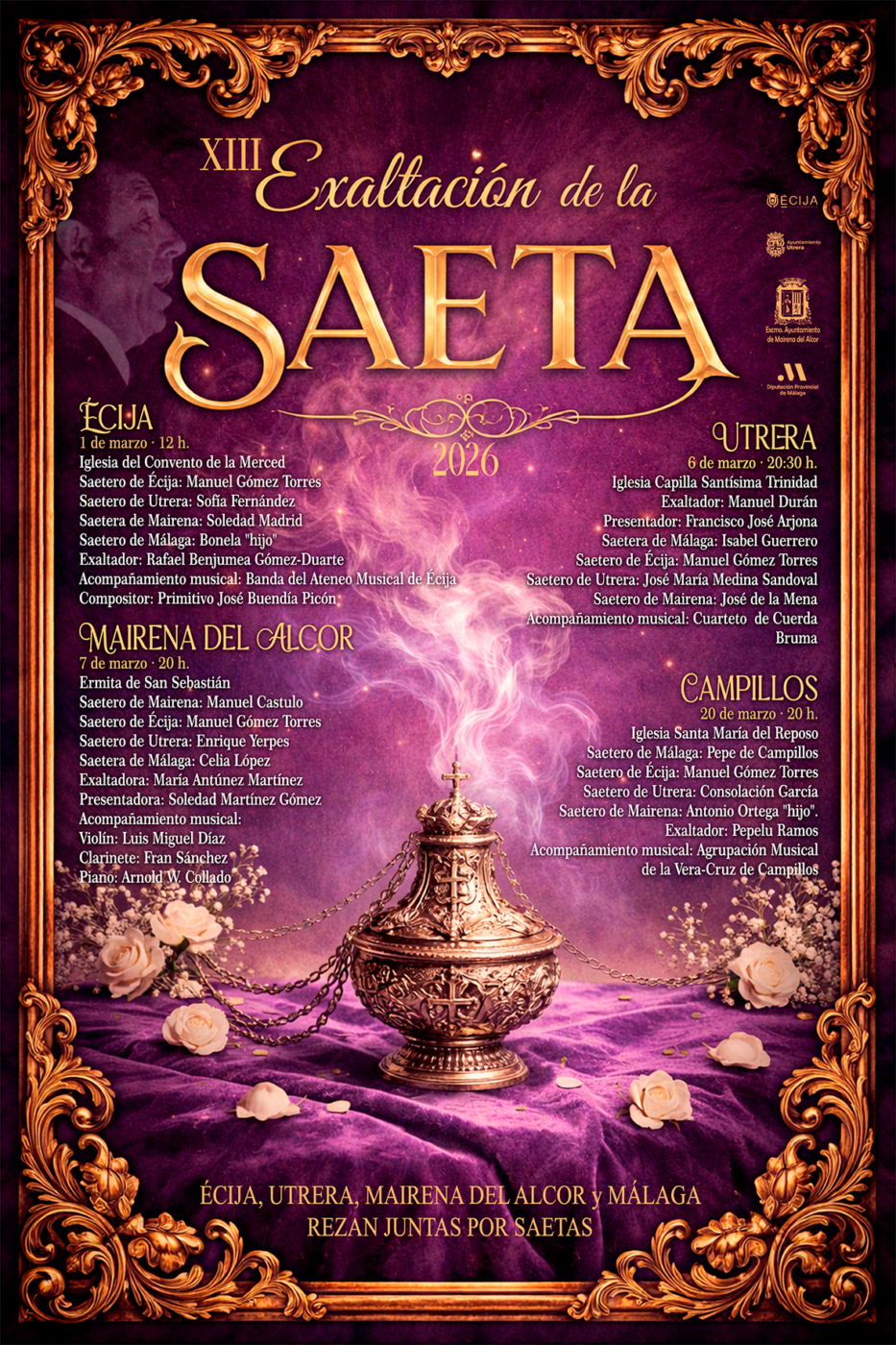 En esta edición XIII, los saeteros, oradores y formaciones musicales de las cuatro ciudades rotarán de manera combinada por los escenarios de la cuatro localidades en un fértil intercambio alrededor del cante oración, aportando los matices propios de cada lugar