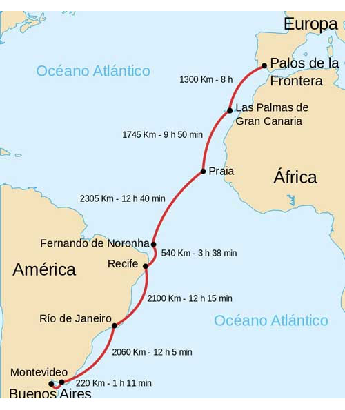 En sus charlas, los maestros explicaron el recorrido del raid aéreo Palos-Buenos Aires. El avión despegó de Palos de la Frontera el 22 de enero de 1926, realizó escala en las Palmas de Gran Canaria y Porto Praia, en las islas de Cabo Verde antes de afrontar el Atlántico abierto cruzando hasta Fernando de Noronha, en Brasil. Continuó costeando la costa brasileña haciendo escala en Pernambuco y Río de Janeiro, llegando a Buenos Aires el 10 de febrero. Recorrió 10.270 kilómetros con un total de casi 60 horas de vuelo. Trazó su rumbo guiándose por las ondas de radio de varias emisoras, utilizando por primera vez el radiogoniómetro, que se convirtió en un aparato imprescindible en los vuelos oceánicos. Además, los maestros impartieron una lección de Geografía sobre los países atravesados por el avión en su recorrido incluyendo algunas referencias históricas al primer viaje de Colón.