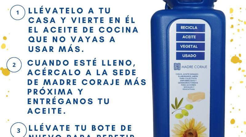 Madre Coraje amplía hasta septiembre su campaña ‘¡A bote pronto!’ de recogida de aceite comestible en Sevilla, Huelva y Granada